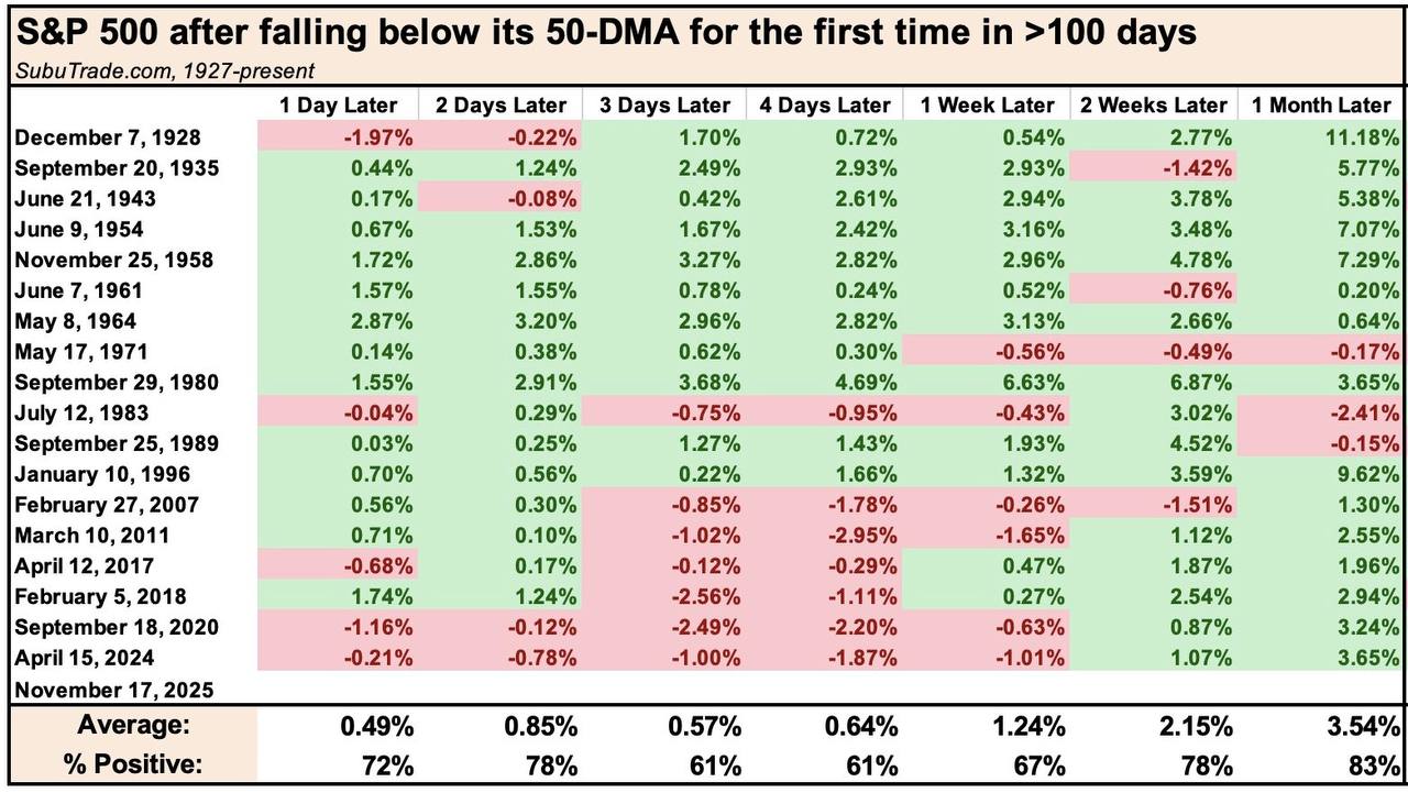 Across 100 years of patterns like this, the first slip under the 50-DMA hasn’t usually meant a trend break. More often, it creates one of those moments traders watch closely — when history tilts the probabilities and the next move becomes more interesting than the drop itself.